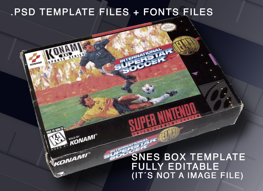 With this purchase you will get two editable digital files (.psd) of the SNES "International Super Star Soccer deluxe" game box and the additional fonts used to make it (if they were used) to make your own backup boxes and protect your retro games, in which each graphic is an independent piece, restored and optimized for impression. Most of the texts are editable (except the main titles and texts with unavailable fonts).